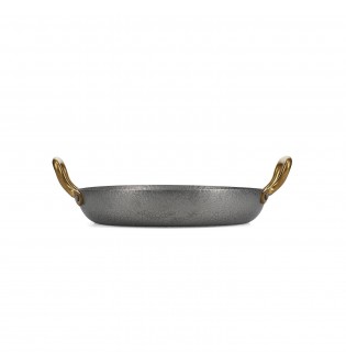 Plat en acier inoxydable, finition vintage effet martelé. Poignée or. Diamètre 24 cm, hauteur 5 cm.