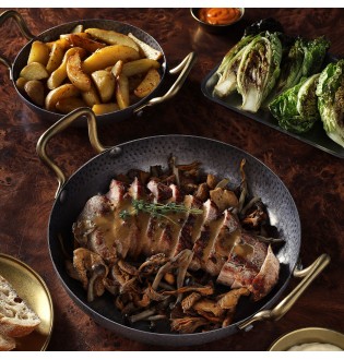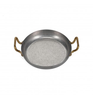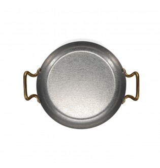 Plat en acier inoxydable, finition vintage effet martelé. Poignée or. Diamètre 24 cm, hauteur 5 cm. Passe au four, lave vaisselle. Conforme aux exigences alimentaires.