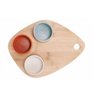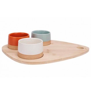 Planche apéritive ou à café gourmand. Planche en bambou de 36 x 27 cm, bols diamètre 9,5 cm, hauteur 5,5 cm.